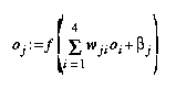 Jedes aktive Neuron im Multilayer Perceptron berechnet die gewichtete Summe der Ausgaben seiner Vorgänger. Zur Berechnung der Aktivierung eines Neurons gehört außerdem die Addition eines Neuron-eigenen Schwellwertes betaj. Diese Aktivierung wird mit Hilfe einer Transferfunktion f in die Ausgabe des Neurons überführt. Bei vier Vorgängern (siehe Abbildung 2):