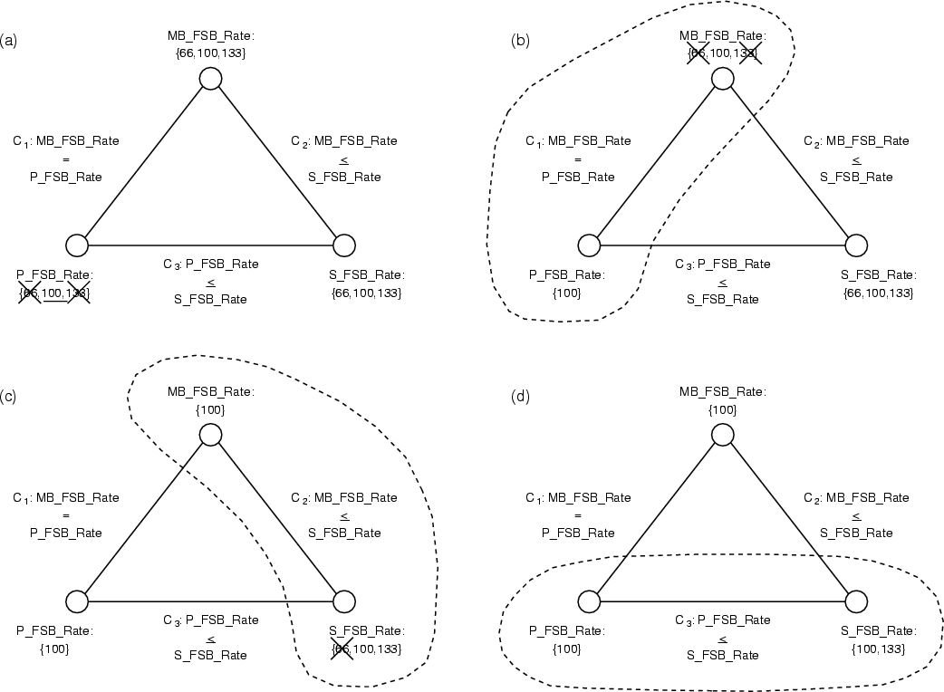 Auch der AC-3-Algorithmus ist noch keineswegs optimal. So werden auch durch diesen Algorithmus bei weiteren Durchläufen mit REVISE noch häufig Wertepaare geprüft, von denen bereits bekannt ist, dass sie kompatibel miteinander sind. Eine Reihe von Algorithmen befasst sich damit, diese Metainformationen zu verwalten und durch weniger Konsistenztests effizientere Laufzeiten zu erreichen (siehe Tabelle 5.1). Der AC-4-Algorithmus von Roger Mohr und Thomas C. Henderson nutzt intern eine separate Datenstruktur zur extensionalen Constraint-Repräsentation (vgl. Mohr und Henderson, 1986). Dadurch wird es möglich, REVISE nur für Wertepaare auszuführen, die von einer vorherigen Wertebereichseinschränkung betroffen sind: Ein Wert in einer Domäne gilt als supported, wenn für diesen Wert konsistente Wertebelegungen für alle übrigen Variablen existieren. Wenn in einer Domäne ein Wert gelöscht wird, müssen nicht mehr alle Werte in den Domänen der mit dieser Variablen über ein Constraint verbundenen Variablen getestet werden, sondern nur noch die Werte, die auf den gelöschten Wert über einen support-Eintrag angewiesen waren.